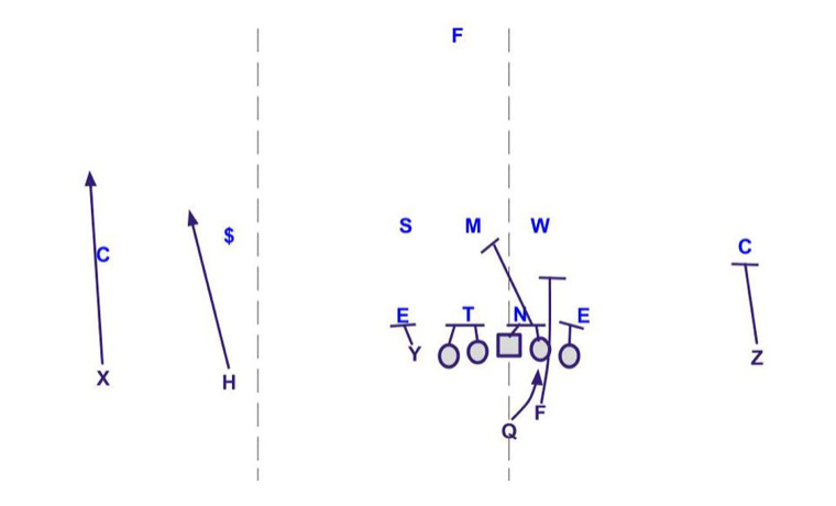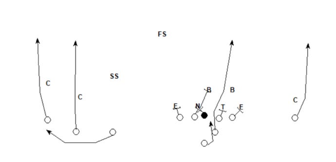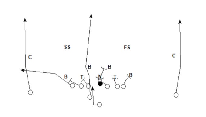 All of the other routes in this play are designed to pull defenders deep and to the sidelines. There is only one read. Super simple, yet effective. The same concept can be run from spread formations too, which naturally creates the horizontal spacing in the defense. It can also be run with an H-back or tight end running the route on a QB dive play action.