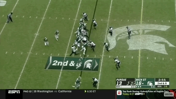 Michigan State has technically removed the fullback from the offense (nobody on the official roster is listed as a fullback) but there are still fullbacks on the team. Max Rosenthal is listed as a tight end, but trust that when he is on the field he will be serving some H-back/fullback-type role. This play is just old-fashioned gap running with the added element of a QB run to create a numbers advantage. People like to say of Bill Snyder that he never shows up to the dance without a +1, referencing his love of the QB run and what it does for the arithmetic of football. I’d use that mindset when building an offense around Lombardi.